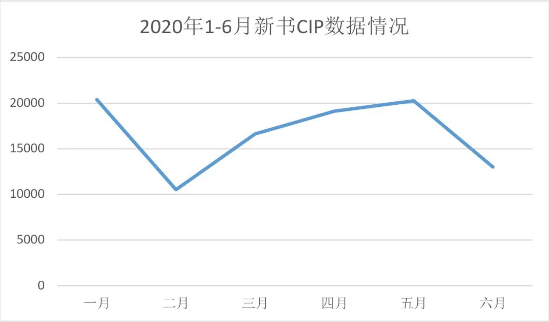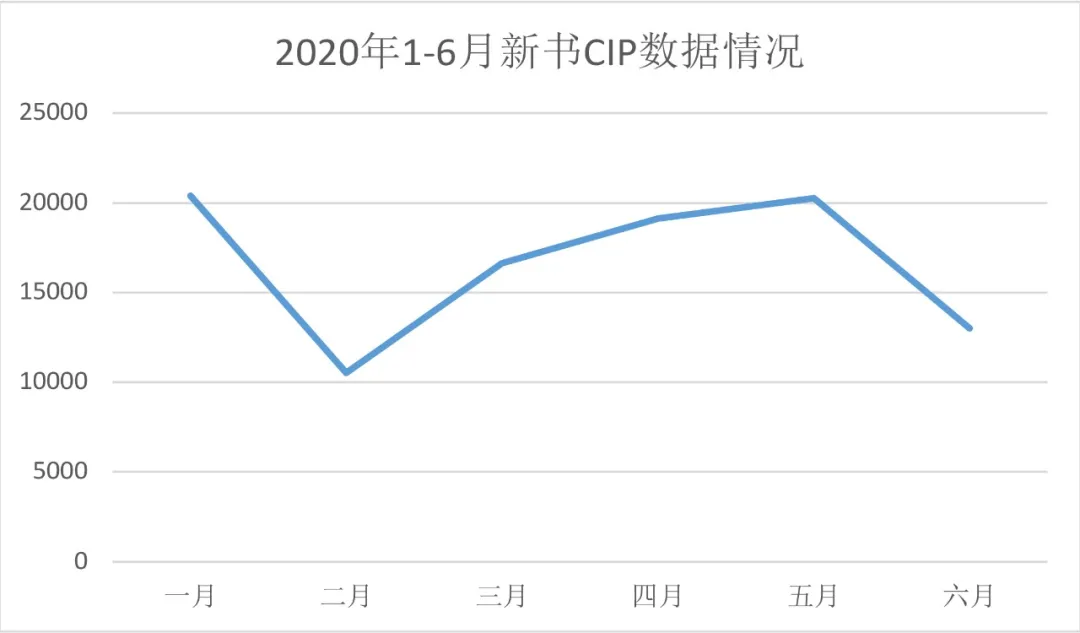 按中图分类法五大部序,2020年上半年新书中社会科学类CIP总量占比最高,以74956种新书占据整体新书总量的74.9%;其次为自然科学类图书,以21078种新书占整体新书总量的21%。相较去年同期,马列毛邓类图书2020年上半年新书CIP总量相较去年同期减少17%;哲学类图书相较去年同期减少21.4%;社会科学类相较去年同期减少22.6%;自然科学类图书相较去年同期减少13.1%;综合类图书相较去年同期减少4.2%。具体到细分类别图书,中图分类法分类22个大类的新书数量均有不同程度的下滑,下滑幅度最大的是军事类图书,达34.8%。下降数量最多的类别则是文化、科学、教育、体育类图书,这类图书中包含大量的教材教辅,仅2020年上半年就比去年减少了近万种新书。从2020年1—6月的新书CIP总量变化或许也能直观地看出疫情对于出版工作的影响,一月份新书CIP总量超过2万种,但受疫情和假期的影响,2月份的新书CIP总量仅有1万种,3月份新书CIP总量则出现了回升,到五月份已经基本恢复至疫情爆发前的水平,但受疫情反复的影响,6月份新书CIP总量下降至13006种,可以预见的是,随着疫情逐渐被控制,出版机构运转效率回归,未来几个月的新书CIP数量将恢复正常水平。