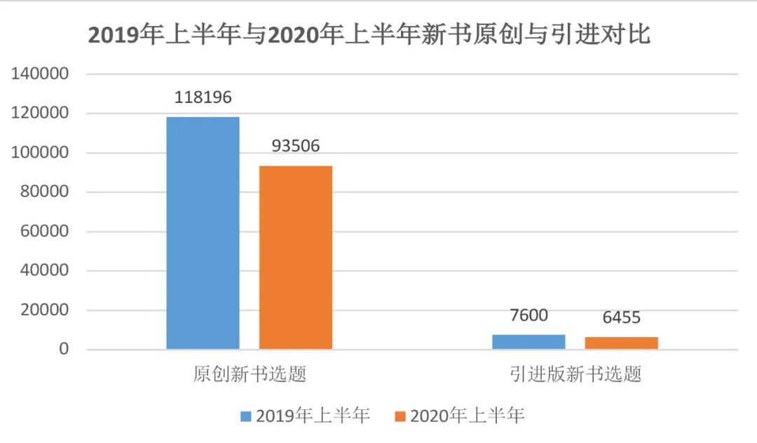 2020年上半年,受疫情影响,出版业的运转效率大打折扣,上半年的新书数量明显下降,在市场端,整体的销售情况较为萎靡,反馈到生产端也导致出版商们在推出新书时更为谨慎。在这种状况下,出版业上半年的整体产能究竟受到了多大的影响,随着疫情发展是否有向好的趋势?为了回答这些问题,《出版人》依据中央宣传部出版物数据中心提供的CIP数据,对2020上半年新书CIP数据情况进行了分析。根据版本图书馆新书CIP数据统计,2020年上半年全国各出版单位共计申报新书选题99961种,较2019年同期的125795种减少了25834种,同比下降约20%。与去年相比,2020年上半年新书CIP数据延续了近年来新书总量下降的趋势,但受疫情影响下降幅度明显增大。从原创与引进的新书来看,2020年上半年全国各出版单位共计申报国内原创新书选题93506种,相较去年同期的118196种下降20.8%;上半年各出版单位申报引进版新书选题6455种,相较去年同期的7600种下降15%。整体而言,引进版新书选题占整体新书比例6.4%。