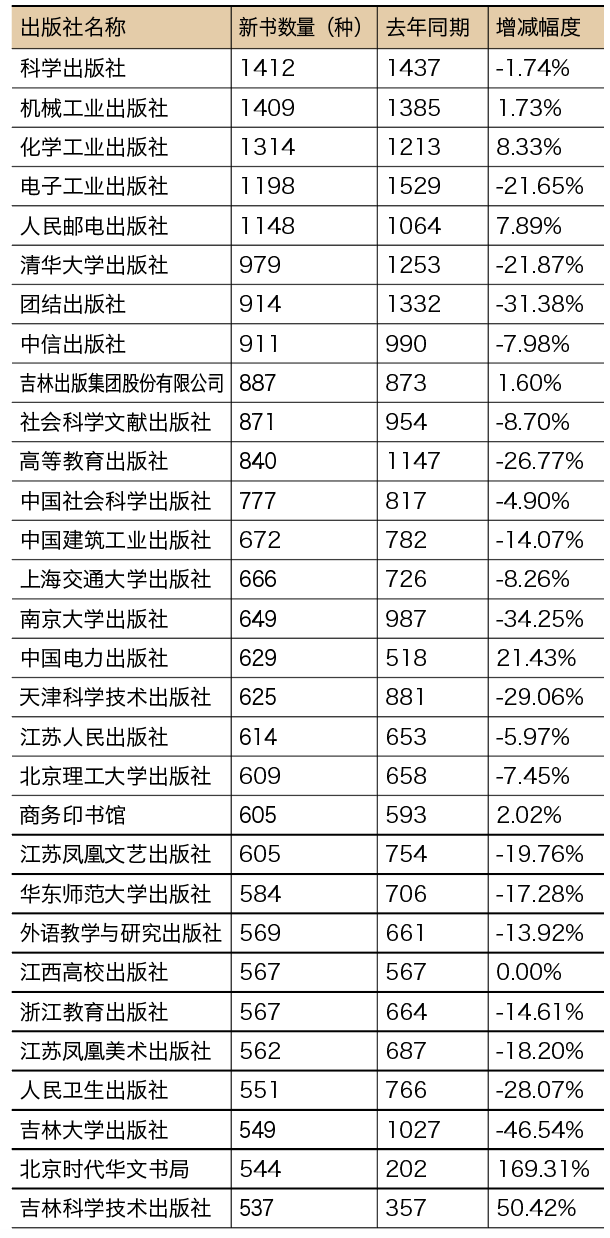 在新书CIP数量Top30的出版社中,有21家出版社的新书总量有不同程度的下滑,其中跌幅最大的是吉林大学出版社,这家大学社2020年上半年新书CIP数量为549种,较去年同期的1027种减少了478种,下降幅度达46.54%。除此之外,30家出版社中共有8家出版社2020上半年的新书CIP数量相较去年有所增加,分别是北京时代华文书局、吉林科学技术出版社、中国电力出版社、化学工业出版社、人民邮电出版社、商务印书馆、机械工业出版社以及吉林出版集团股份有限公司,其中北京时代华文书局以169.31%的增幅,成为排名新书CIP数量Top30名单中增幅最大的出版社,相较去年同期,北京时代华文书局上半年新书CIP增加了342种,也是新书CIP数量Top30增长数最多的出版社。