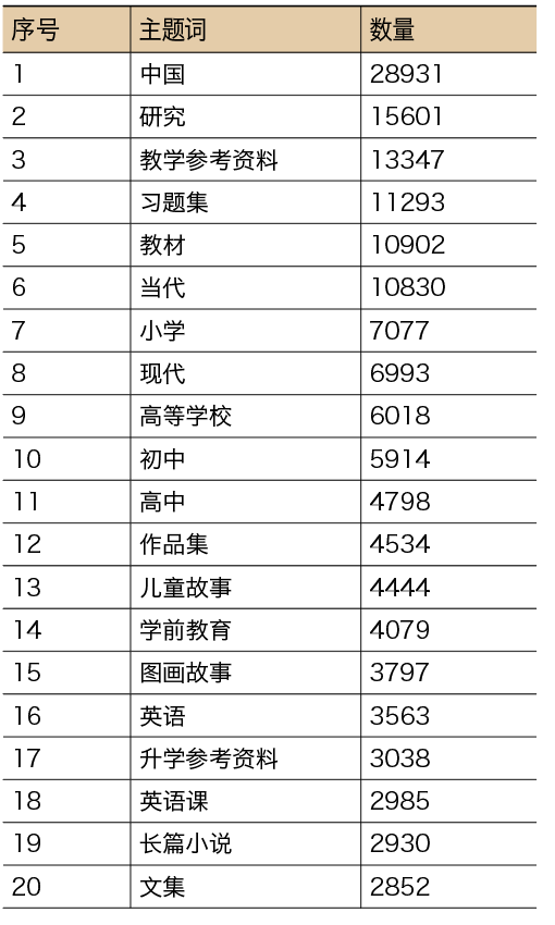 整体而言,2020年上半年新书定价主要集中在30~100元之间,超过6万种新书定价处于这一区间。除此之外,有2047种新书定价在0~10元,定价在100~2000元的新书有16432种,383种新书定价超过2000元。具体到细分类别,除了新书定价中位数为180元的综合类图书,新书定价中位数最高的为航空航天类新书,2020年上半年其新书定价中位数为70元,航空航天类也是新书定价中位数同比增幅最大的一类,相较去年增长20.6%;新书定价中位数最低的则是文化、科学、教育、体育类图书,2020年上半年这类书的新书定价中位数为35.8元。从中位数变化来看,综合类新书定价中位数相较去年没有变化,医药卫生类新书定价中位数相比去年小幅下降,除此之外的20类新书定价均有不同程度的增长,航空航天类、军事类、艺术类、自然科学总论类、天文学类、工业技术类、经济类、环境科学类、政治法律类、社会科学总论类、马列毛邓类、农业科学类等12类新书定价中位数相较去年涨幅10%以上。从CIP信息中的主题词则可以看出2020年上半年新书出版的热点。根据数据显示,2020年上半年CIP数据中主题词包含“中国”的新书接近3万种,除此之外,包含“研究”“教学参考资料”“习题集”“教材”“当代”等主题词的新书均超过一万种。纵观新书CIP主题词数量Top50可以看出,尽管文教图书相较去年同期减少了近万种,但仍旧是今年出版的热点,数量Top50的主题词中与学前教育、初高中等学龄教材教辅相关的超过50%。除此之外,“儿童故事”“儿童读物”“少儿读物”“儿童小说”等主题词的上榜也体现了少儿出版的火热。值得一提的是,“美国”和“英国”是除“中国”外为数不多上榜的国籍相关主题词,2020年上半年共有1299种新书CIP主题词中包含“美国”,1113种新书主题词包含“英国”。表2 2020年上半年新书CIP主题词数量Top20